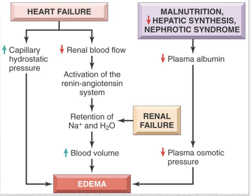 edema flow chart with heart failure, renal failure, and malnutrition/ decreased hepatic syn/ nephrotic syndrome