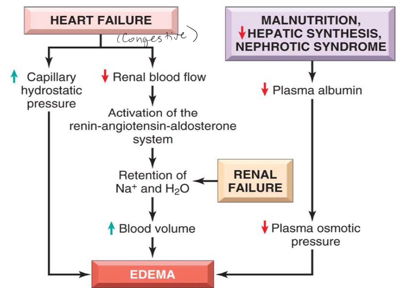 Either increased hydrostatic pressure or decreased osmotic pressure (leads to net accumulation of fluid in interstitium)