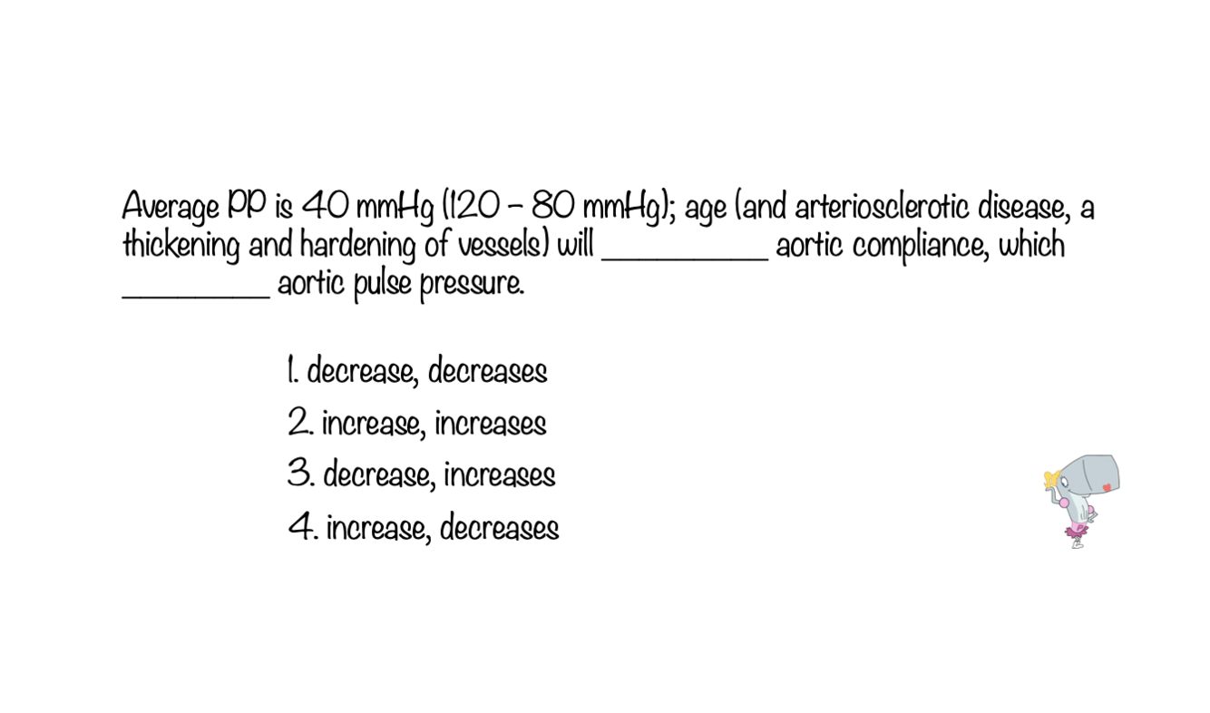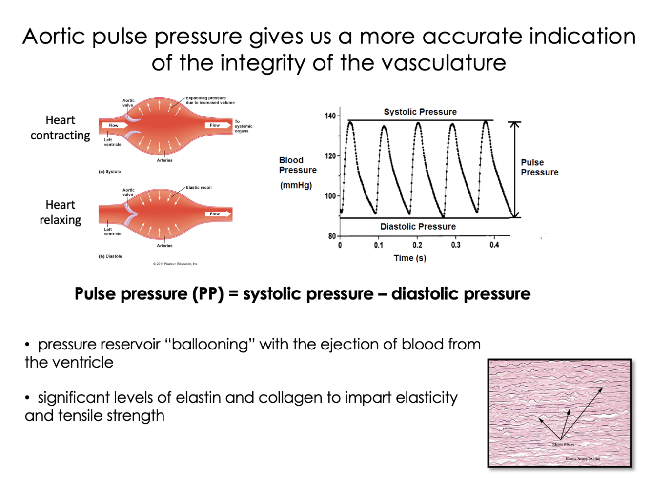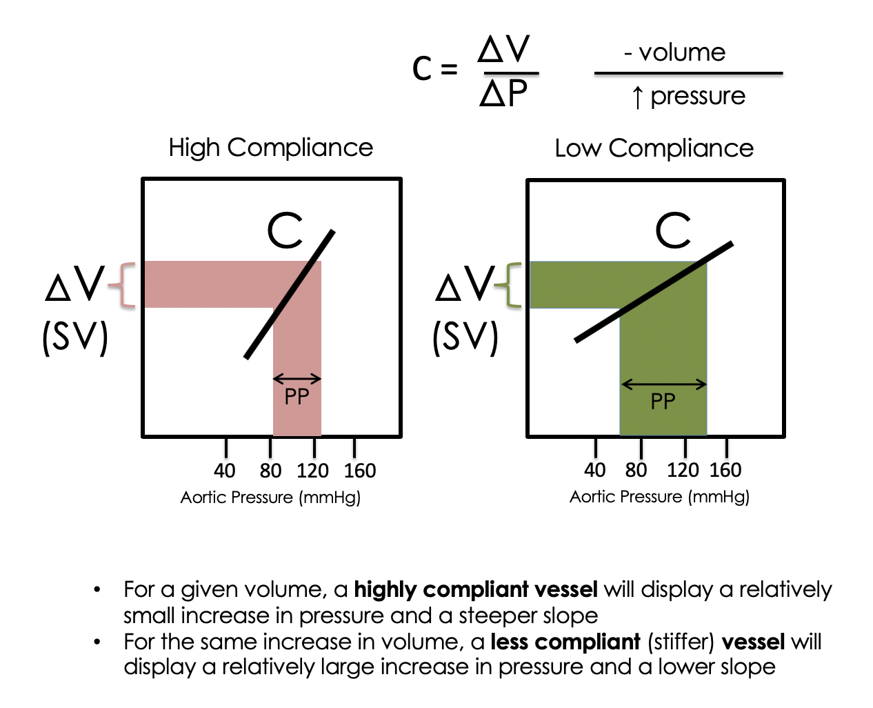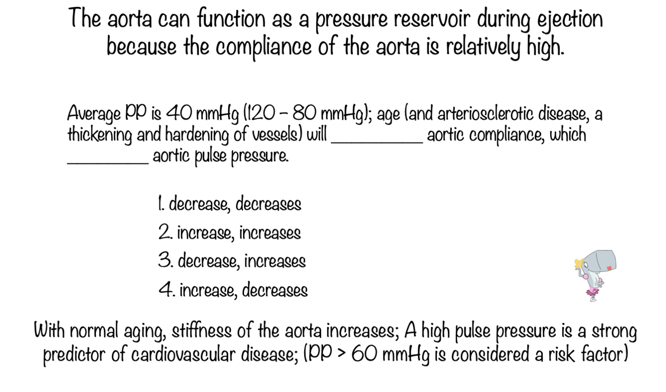 The aorta is more compliant that the systemic arteries. Therefore, blood in the aorta will display a lower increase in pressure for a given change in volume or distention of the vessel. The systemic arteries distend less than the aorta, so for the same level of distention, there will be a larger change in pressure. Therefore, the pressure measured at the brachial artery is actually higher than it is in the aorta. The systolic pressure increases, while the diastolic pressure decreases leading to a greater pulse pressure in the BA vs. aorta.