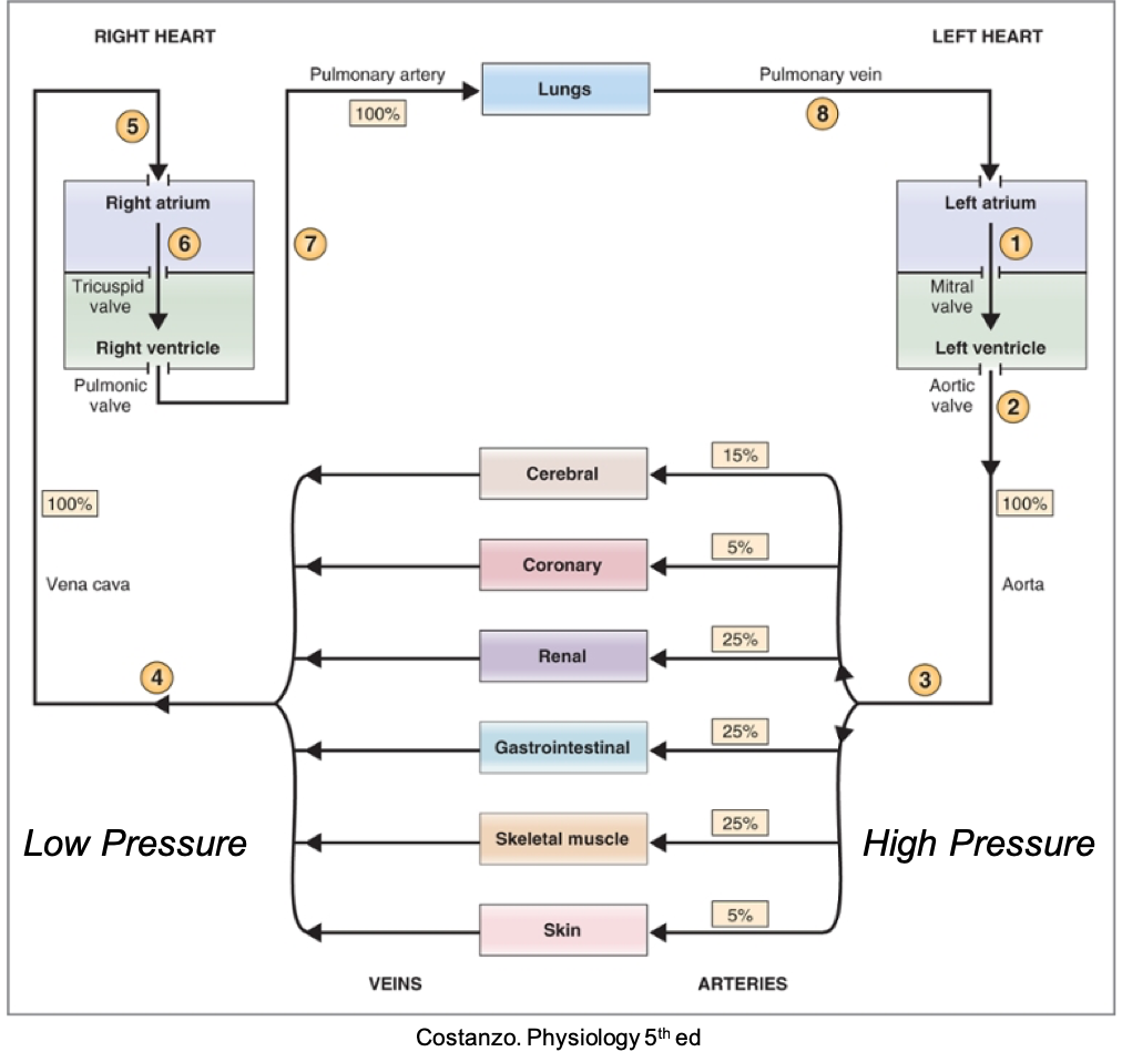 The heart is a 2 stroke pump. The left side pumps into the systemic circulation. This is the………… pressure side of the circulatory system. Return is via veins. This is the…………. pressure side. The Right side of the heart pumps into pulmonary circulation.