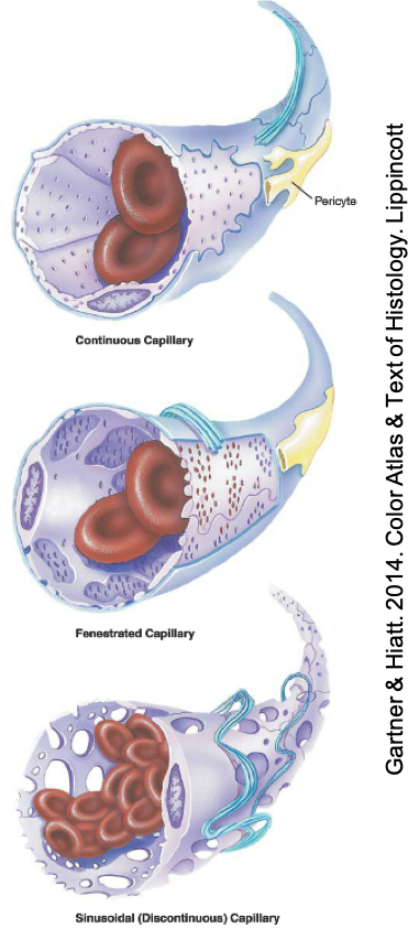 – Continuous capillaries: where endothelial cells touch each other. MOST COMMON.
