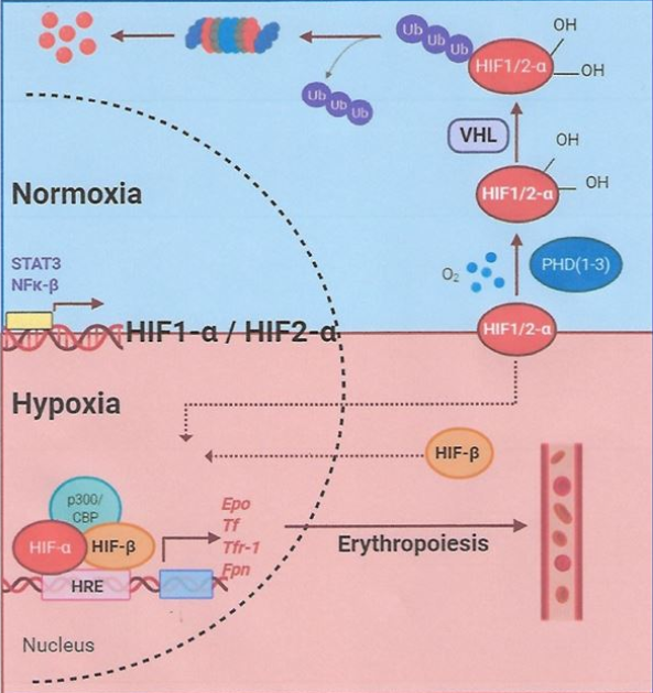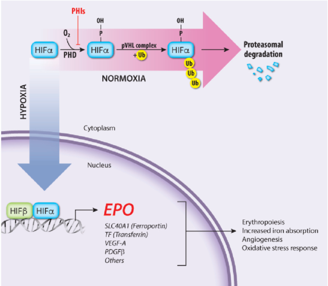 Increased oxygenation - specific prolyl hydroxylases will hydroxylate proline and asparagine residues in HIFα (undergoes ubiquination by the von Hippel-Lindau (VHL protein complex)