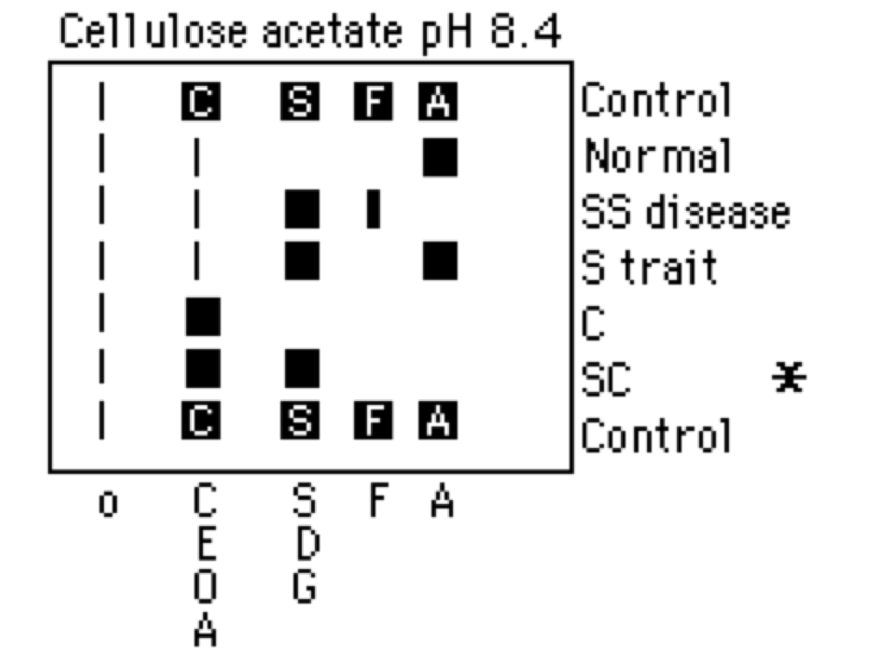 –Hemoglobin electrophoresis - Hgb S = 80-90%, Hgb F = 1-20%, Hgb A2 = 2-3%