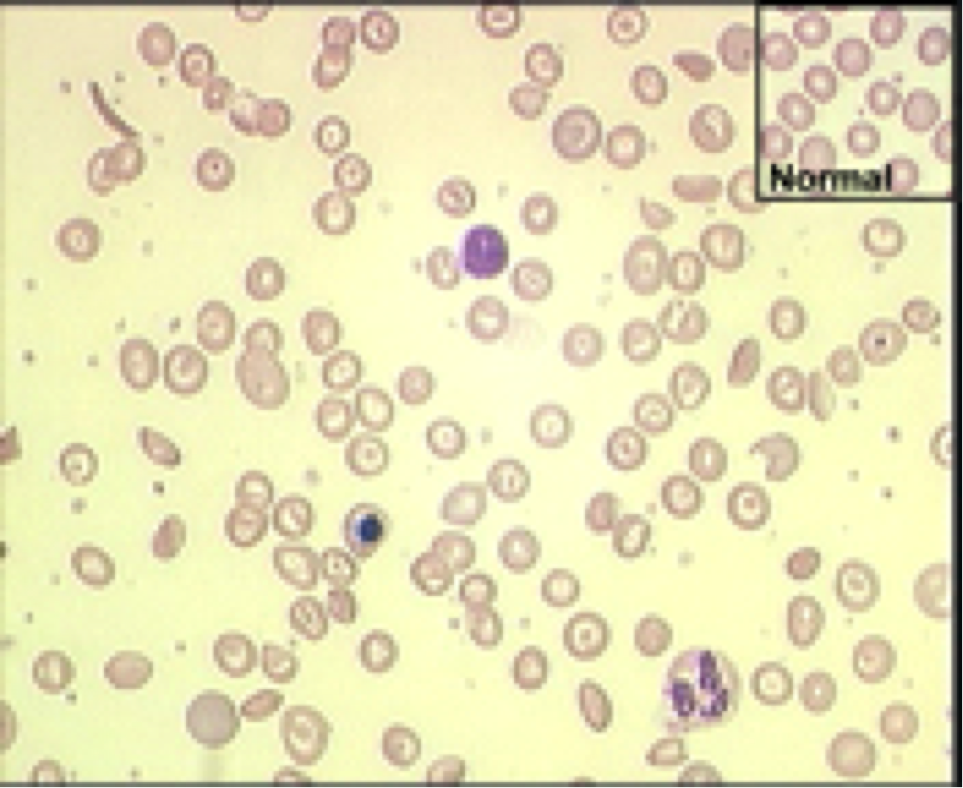 –Blood smear - target cells, sickle cells, nRBC, schistocytes, siderotic granules, Howell-Jolly bodies