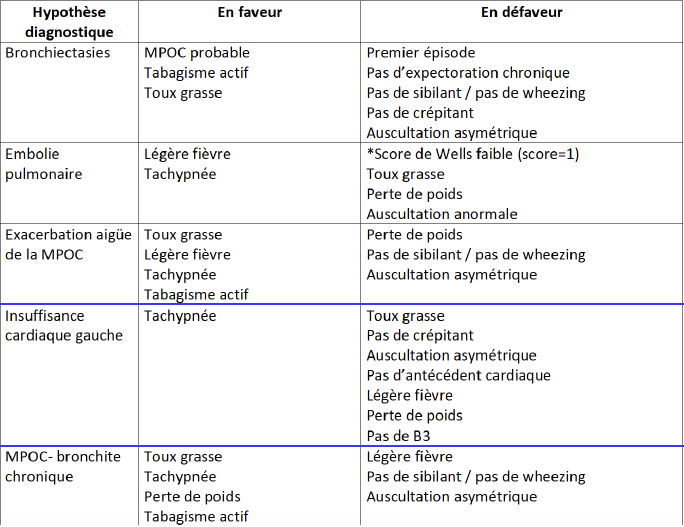 En présence d’une symptomatologie de maladie chronique, mais sans trouble identifié un cancer ou une tuberculose doivent être évoqués, bien que l’hémoptysie puisse être la première manifestation du cancer du poumon chez un patient par ailleurs asymptomatique.