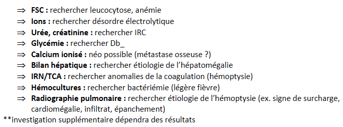 En cas d’hémoptysie massive, le patient doit être traité et stabilisé, généralement en USI, avant de débuter les examens. En cas d’hémoptysie mineure, le patient peut être exploré en ambulatoire.