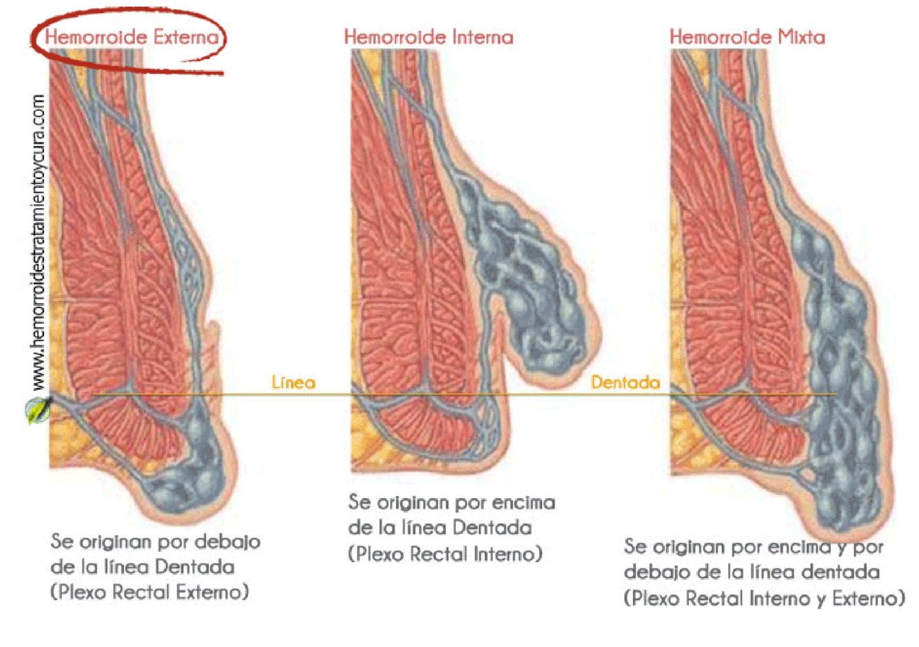 Externas (bajo la línea pectínea), internas (por arriba de la línea pectínea) y mixtas (afectan ambos plexos).
