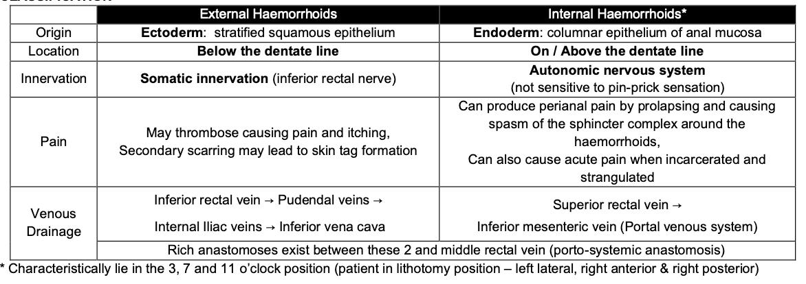 Distinguish between internal and external hemorrhoids.