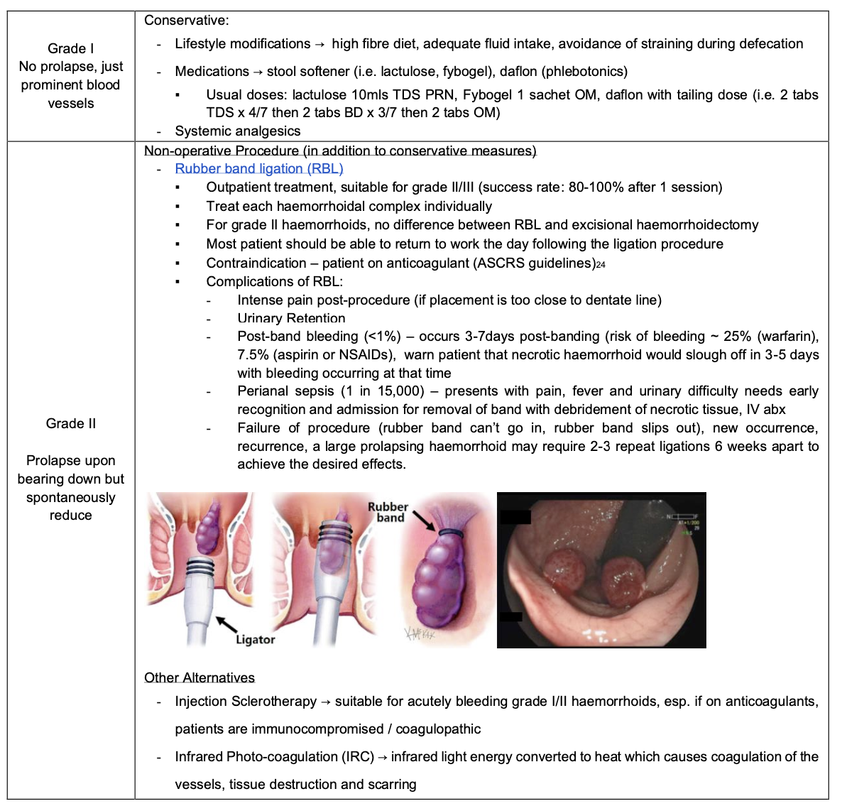 What is the treatment for grade 1 and 2 internal hemorrhoids?