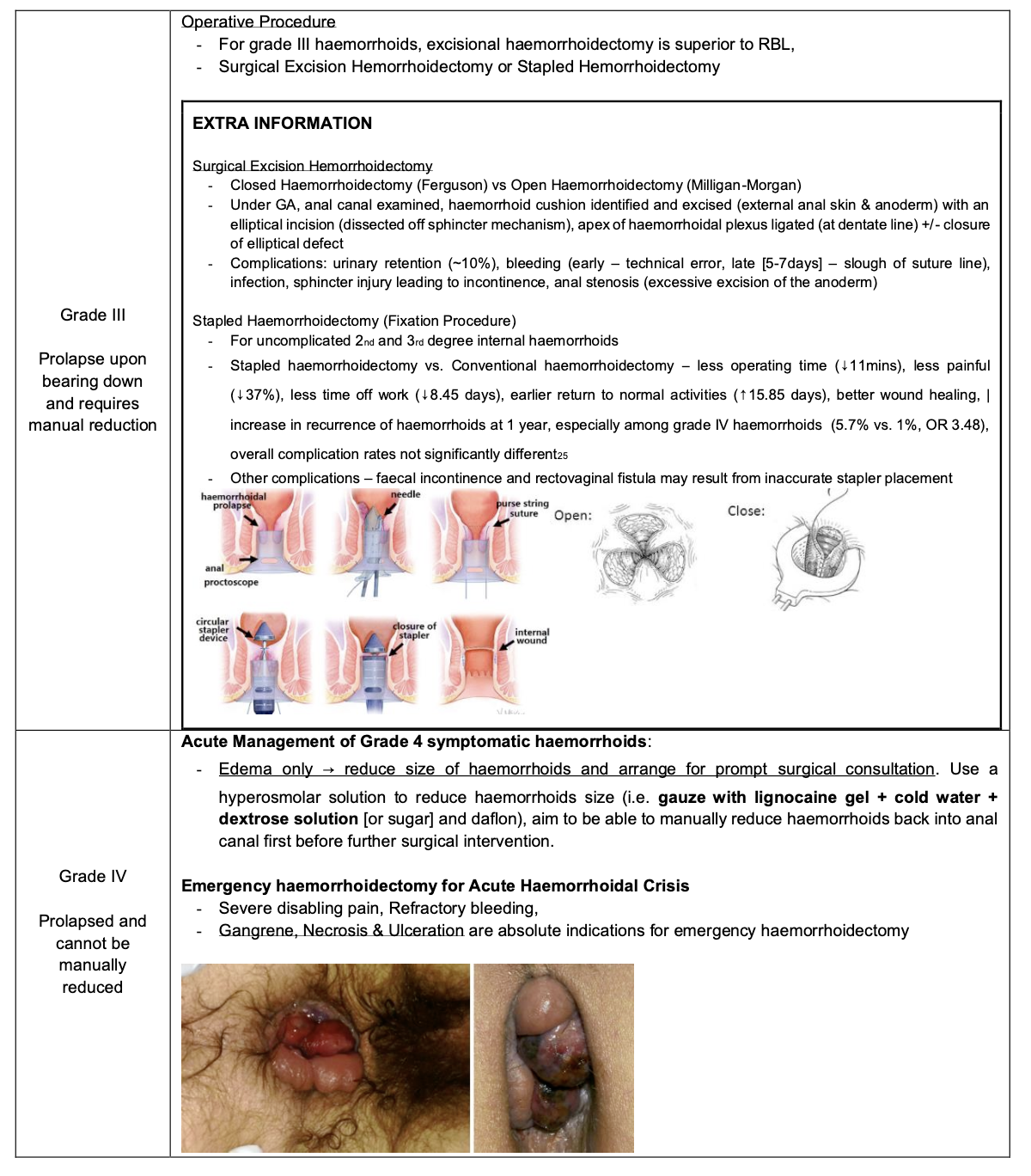 What is the treatment for grade 3 and 4 internal hemorrhoids?