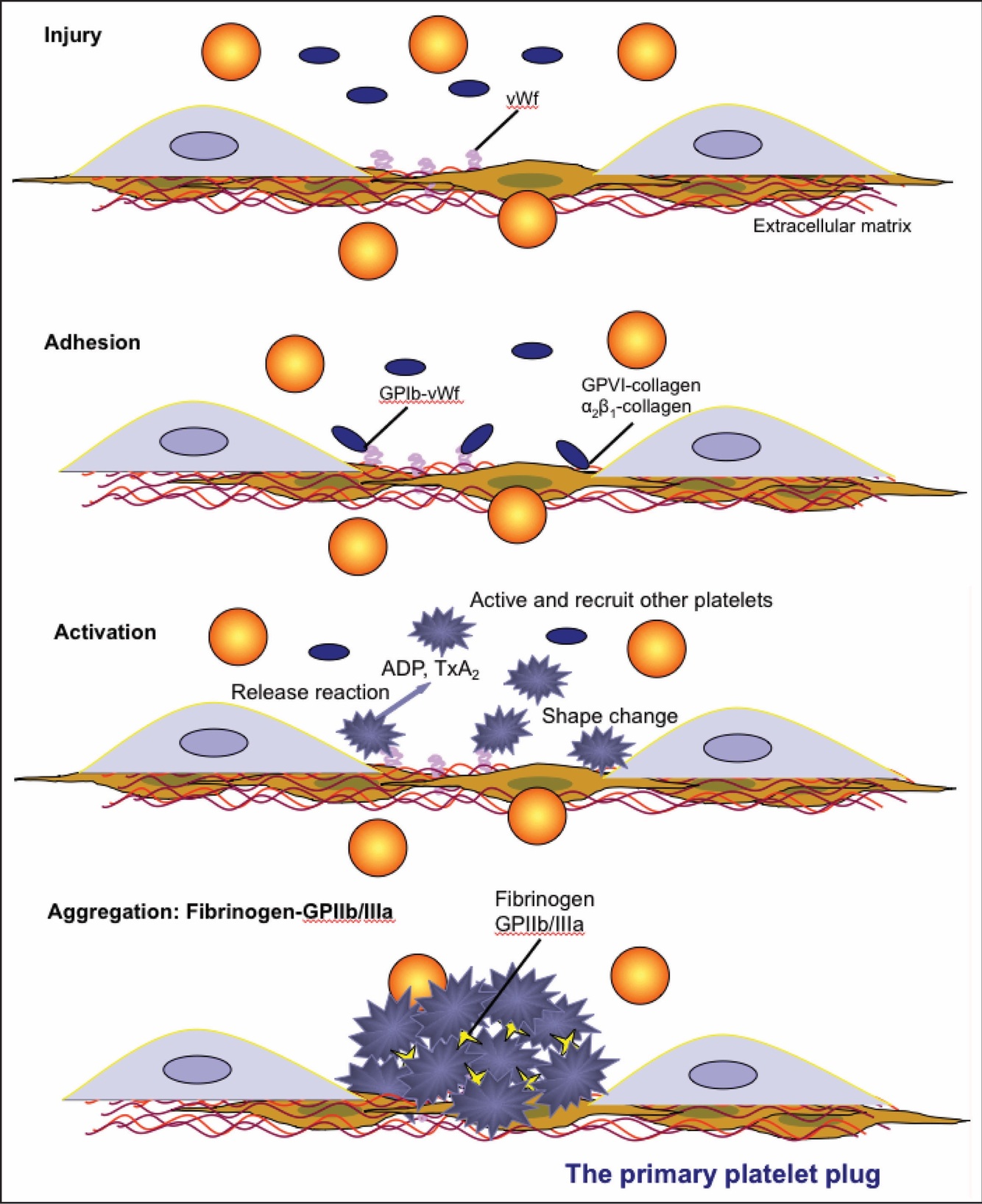 Granula frisätts vid trombocytaktivering efter adhesion vid kärlskada, när trombocyten har bundit till subendotelialt kollagen direkt via GpVI och GpIa/IIa eller indirekt via GpIb till vWF.