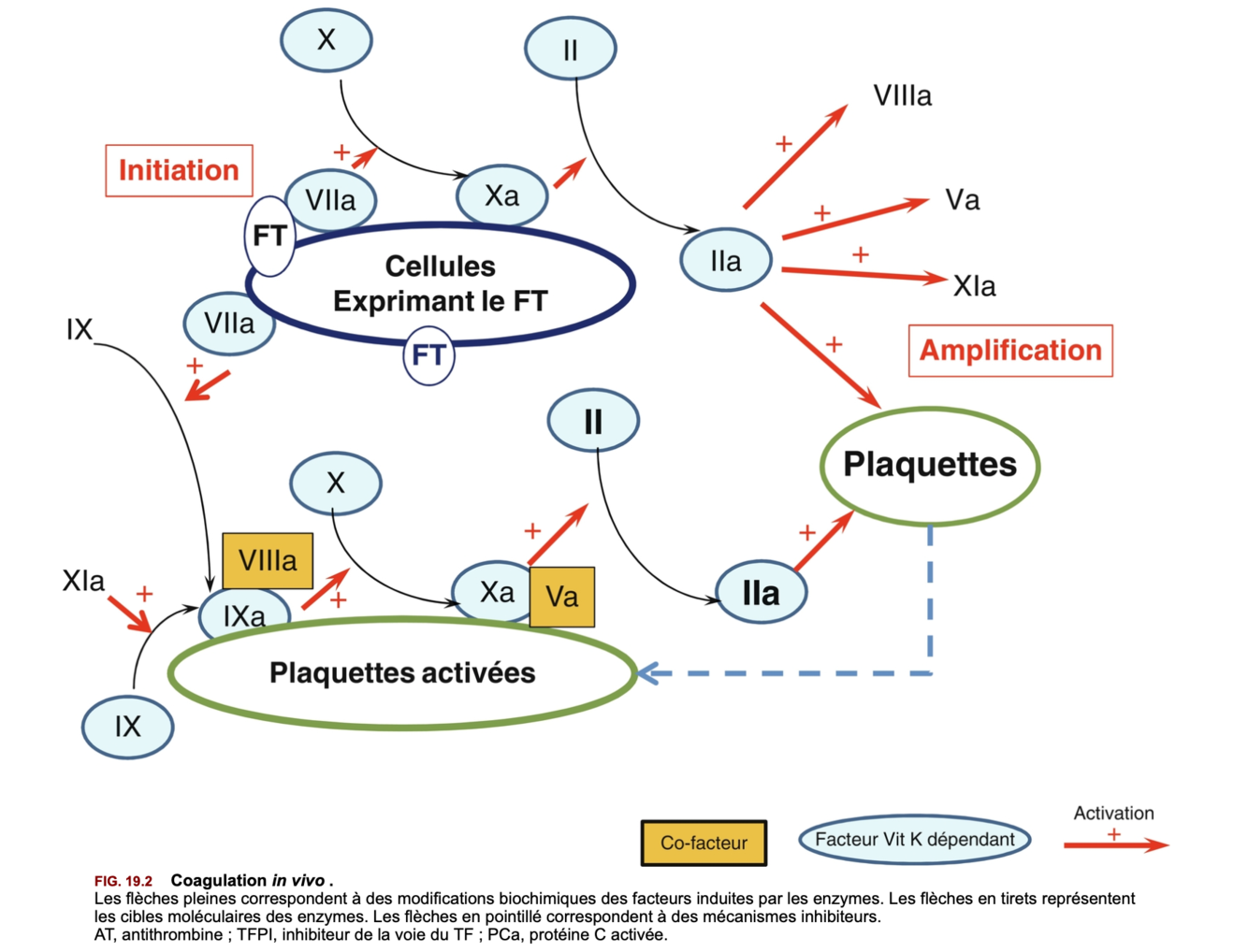 Cette voie d’amplification est mise en jeu grâce aux traces de thrombine générée par la voie directe, qui active le FVIII (et donc la formation de la ténase), le FV (et donc la formation de la prothrombinase) et les plaquettes, source de phospholipides procoagulants.