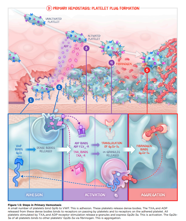 Upon injury to vessel walls - platelets aggregate and adhere, forming a plug to prevent blood loss (primary hemostasis)