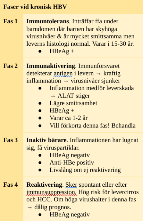 Det finns 4 st faser vid kronisk hepatit B. Vilka?