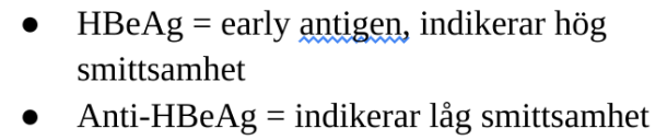 Vid den akuta infektionen några veckor efter exposition uppstår ikterus och ALAT-stegring. Då produceras HBsAg (Ag mot ytprotein), anti-HBc IgM (akut infektion ak, mot coreproteiner), HBeAg (early antigen).