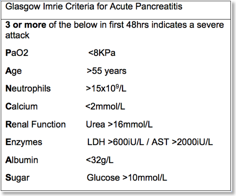 Should be used within first 48hrs of admission and any pt scoring =/>3 should be considered to have severe pancreatitis and HDU care referral is warranted. Factors assessed include: