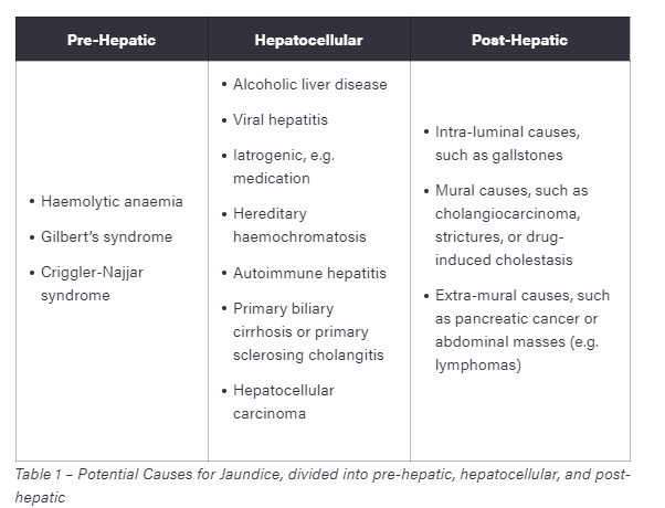 Remind yourself of some pre-, intra- and post-hepatic causes of jaundice