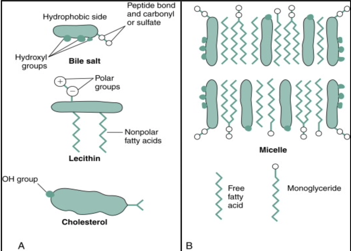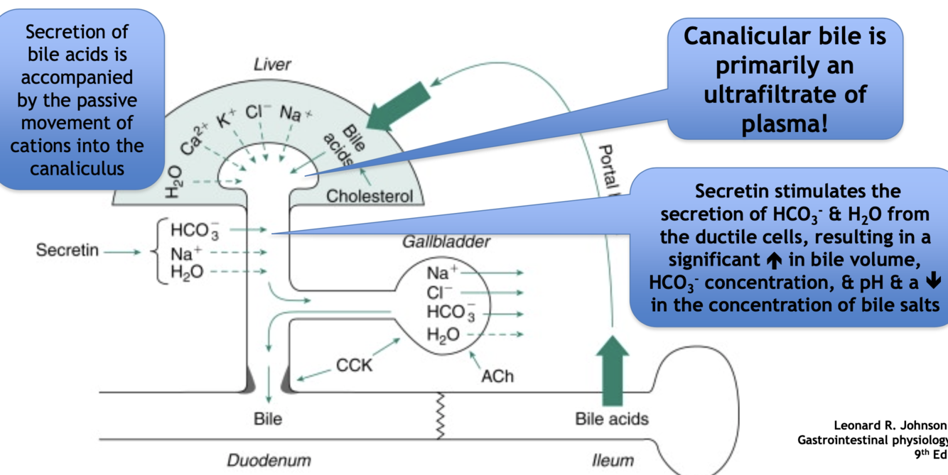 2) bile salts are stored/conc in gallbladder (absorption of ions/H2O)