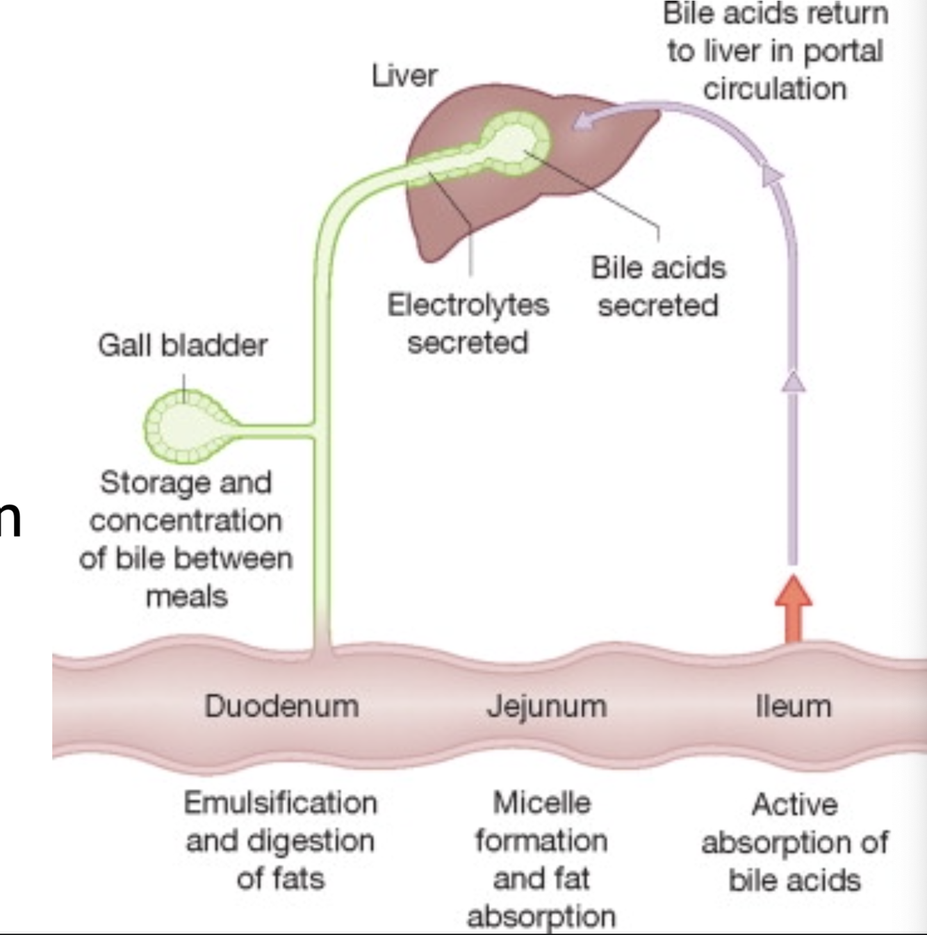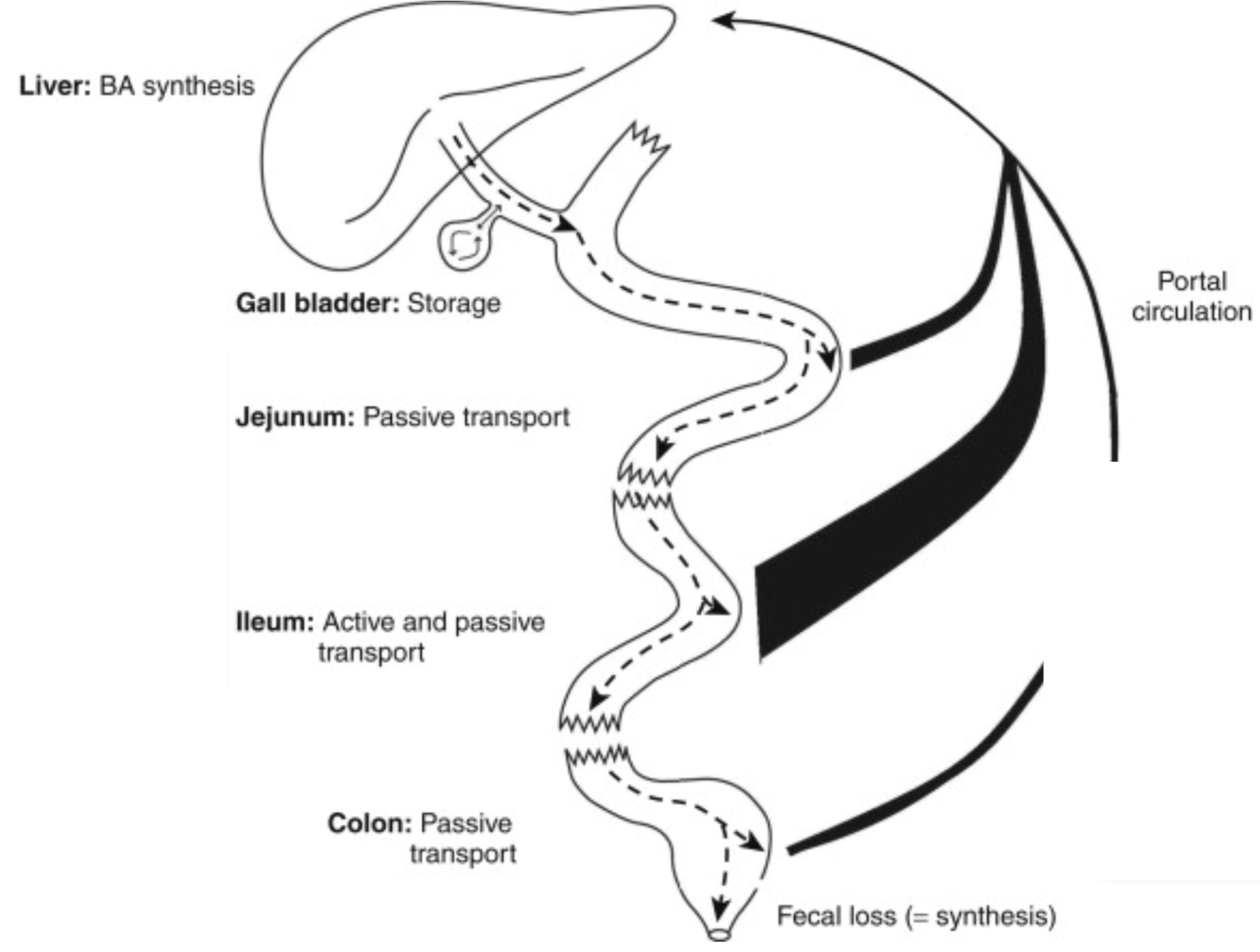 4) absorption of bile salts into portal circulation