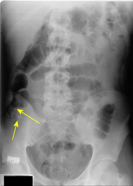 What is going on in this KUB? This patient also has a left renal stone, but ignore that and focus on the other thing.