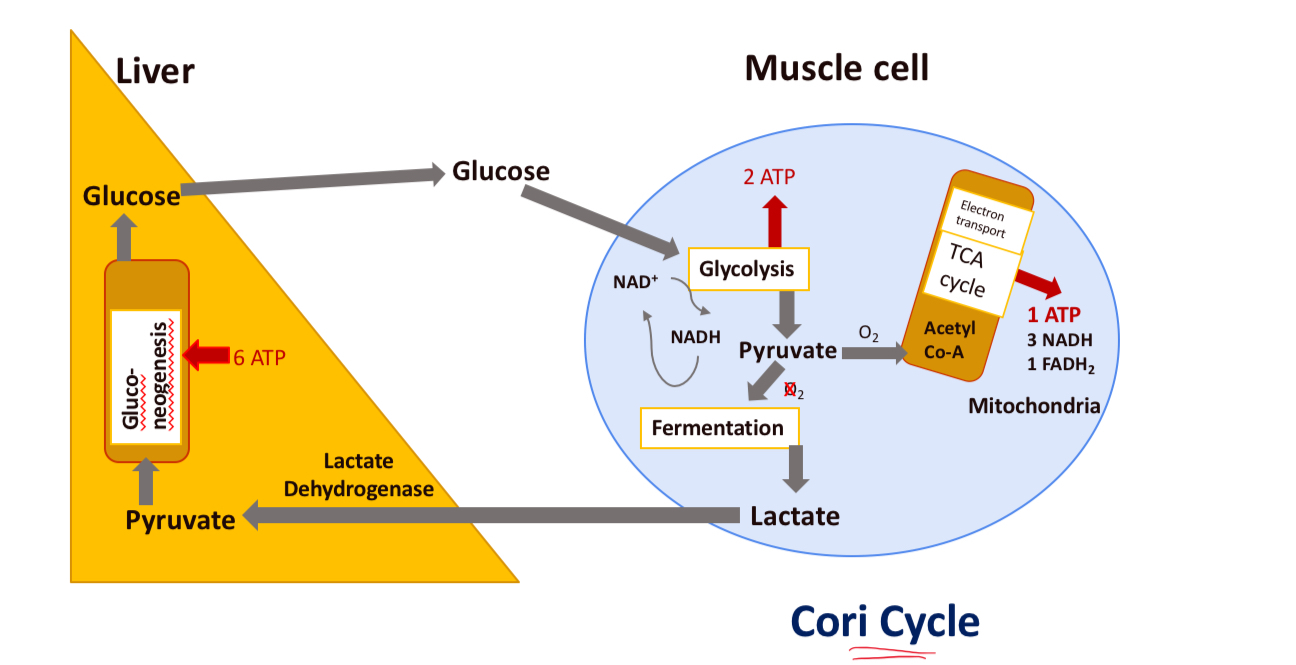 Pyruvate converted to Lacate in muscle and it is transported to liver where it is converted back to pyruvate.