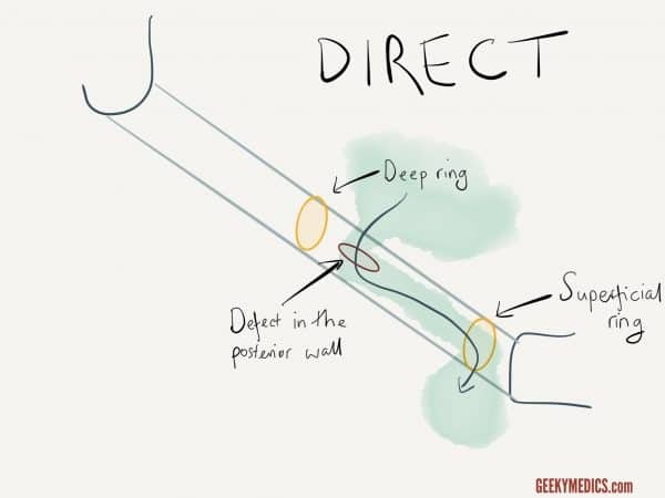 position of direct inguinal hernia in relation to inf epigastric vessels