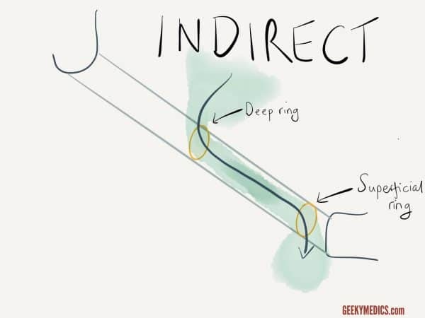 position of indirect inguinal hernia in relation to inf epigastric vessels