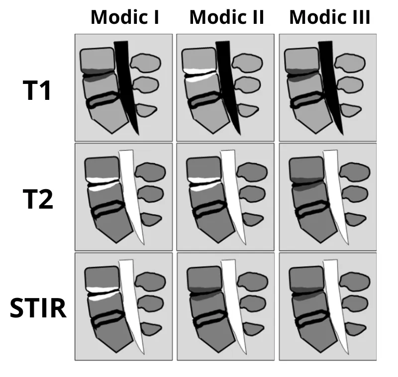 Modic tipo I ou edema ósseo medular: hipersinal T2, hipossinal T1 e hipersinal STIR;