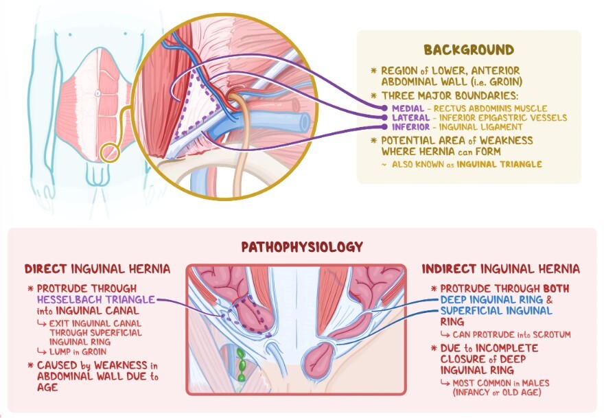 Direct = medial to epigastric vessels & goes striaght thru abdominal wall