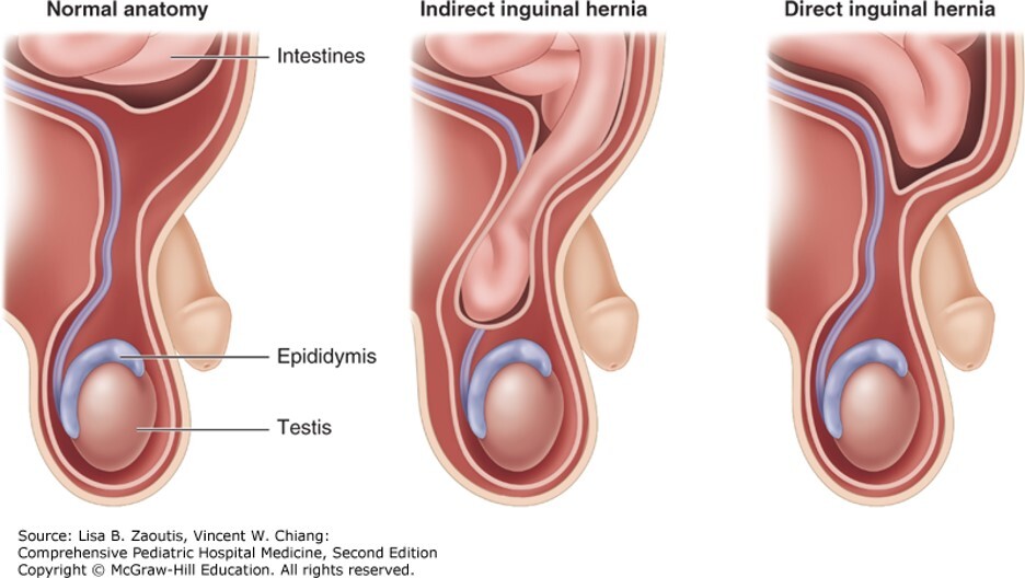 -It rarely will protrude into the scrotum.