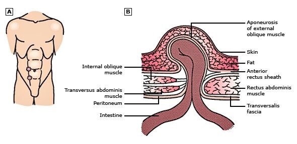 -Occurring between the umbilicus and the lower part of the rib cage in the midline of the abdomen, these hernias are composed usually of fatty tissue and rarely contain intestine.