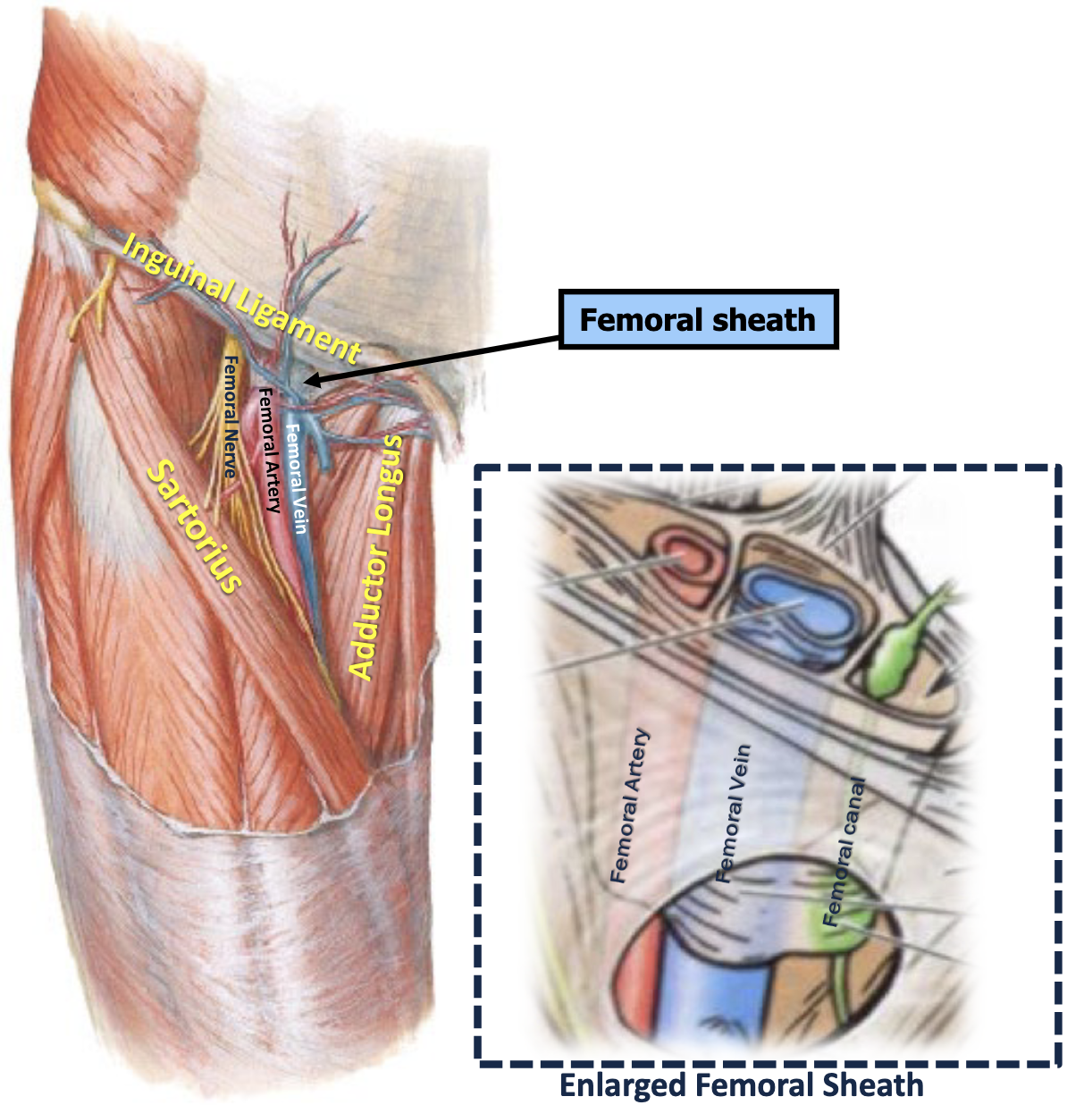 The femoral sheath surrounds femoral artery , femoral vein, and femoral canal