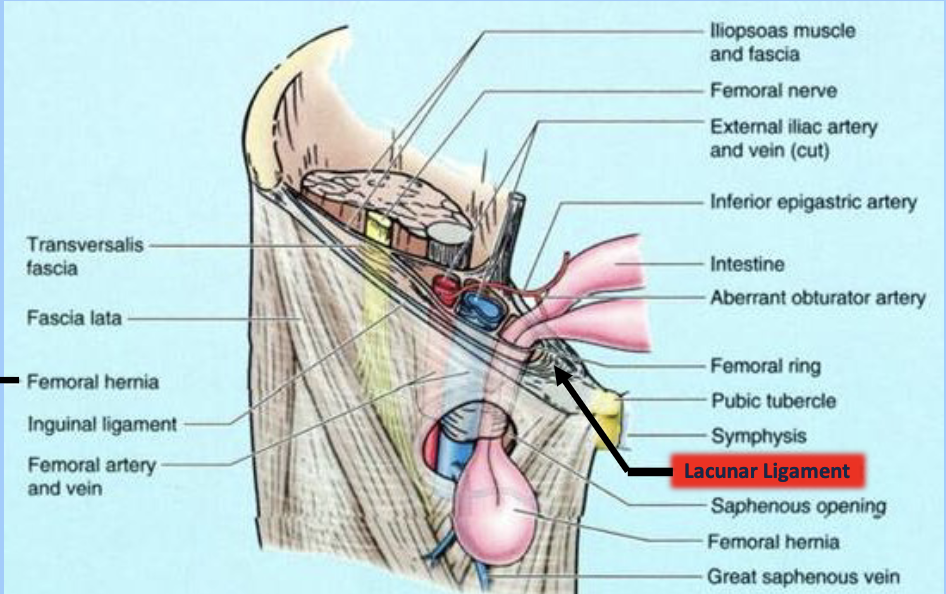 The lacunar ligament is very tight and can sometimes cause strangulation of the loop of bowel and result in necrosis