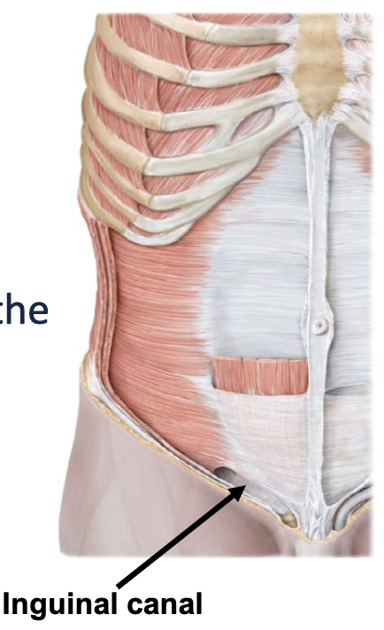 The _ is an oblique passageway through the inferior abdominal wall, which allows structures to pass from inside the abdominal cavity to the outside perineal region (location of the external genitalia)