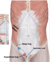 Complete direct and indirect inguinal hernias exit the _