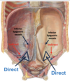A direct inguinal hernia protrudes through the inguinal triangle and may enter the medial part of the inguinal canal