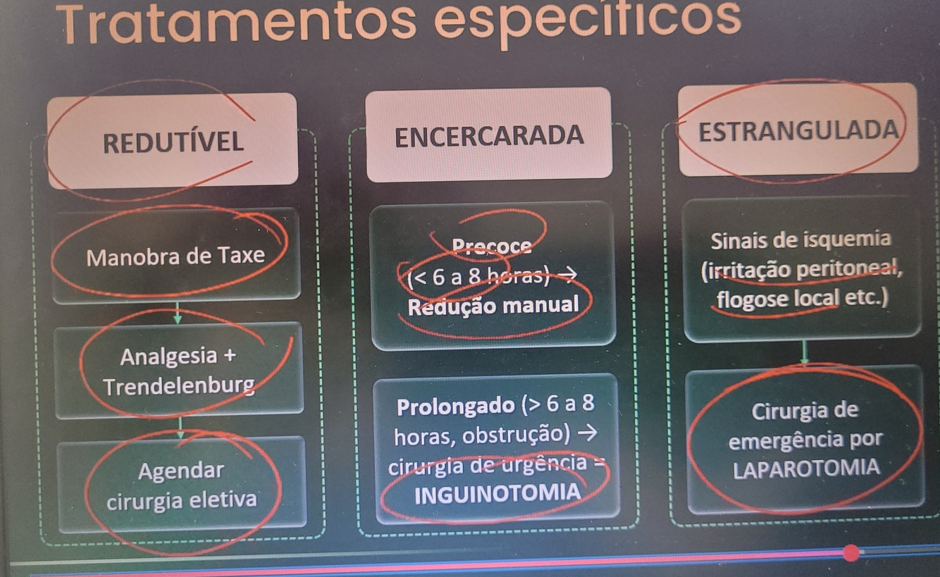 Quais o fluxograma específico para cada tipo de hérnia: redutível, encarcerada/irredutível e estrangulada?