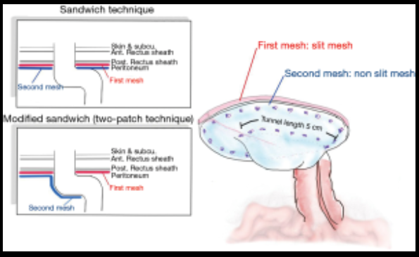 A tela é colocada intraperitonealmente, com um furo central (keyhole) por onde passa o estoma. As bordas da tela são sobrepostas, como um “sanduíche”, envolvendo o estoma.