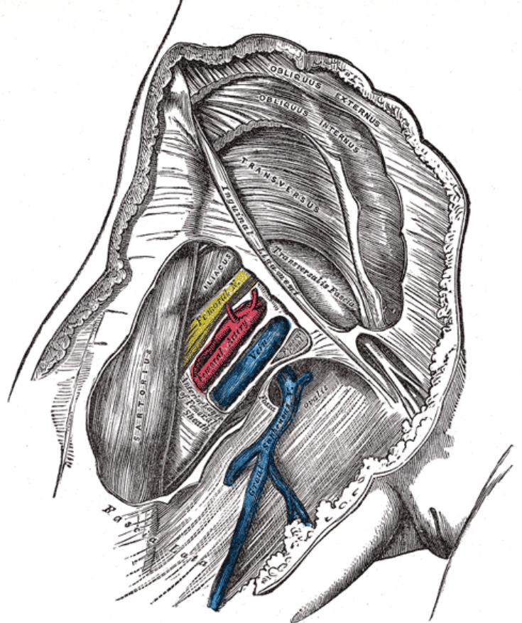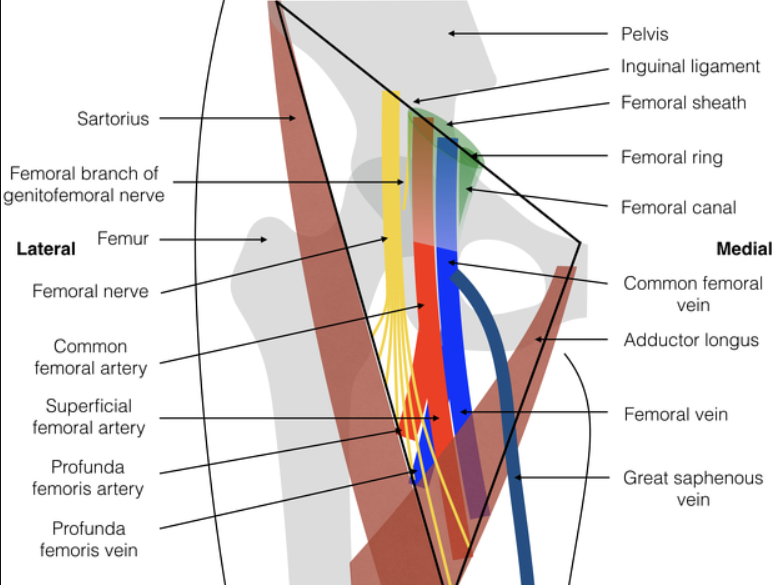 O compartimento intermediário e o compartimento lateral acomodam a veia femoral e a artéria femoral, respectivamente. O compartimento medial é conhecido como canal femoral e contém vasos linfáticos e um linfonodo.