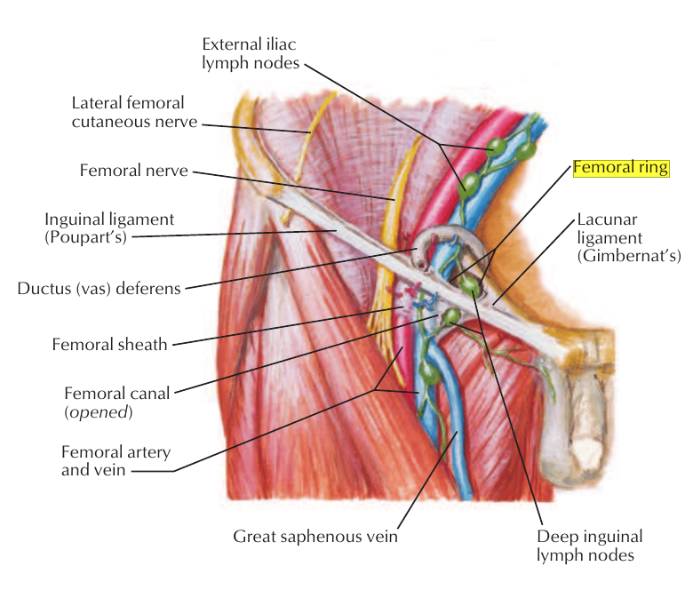 O canal femoral, nessa medida, é vertical também. Sua “abertura” superior, para o abdome, é o anel femoral.