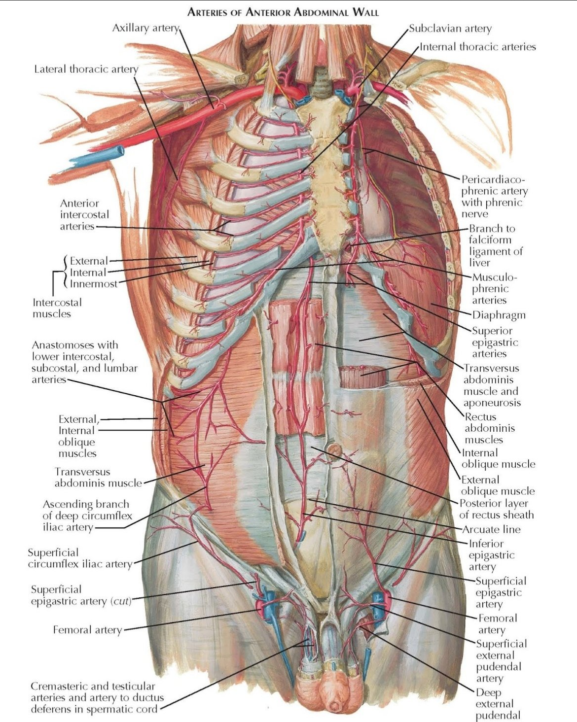 A artéria epigástrica superior origina-se da torácica interna, e desce pelo abdômen, até realizar anastomose com a epigástrica inferior, mais ou menos na altura do umbigo.