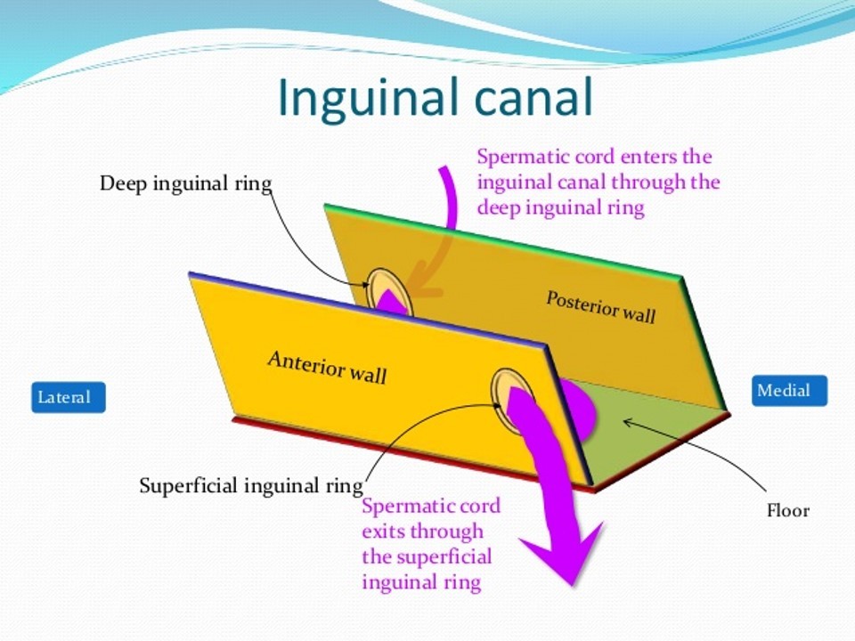 Starts at deep inguinal ring and ends in superficial inguinal ring.