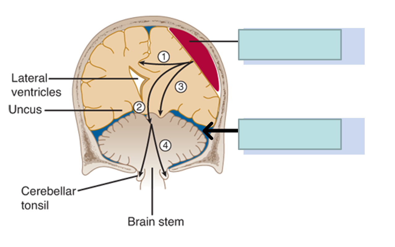 _____ herniation is under the falx cerebri. This causes compression of the _______