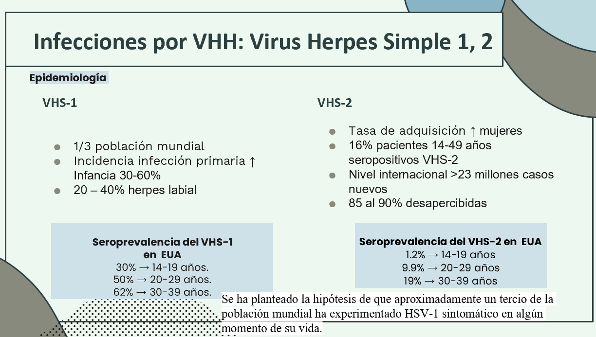 EN ESTADOS UNIDOS, DURANTE 2015-2016 LA PREVALENCIA DE VHS-1 FUE DE 47.8% EN EL GRUPO DE 14 A 49 AÑOS, EL 71.7% CORRESPONDIÓ A PERSONAS DE ORIGEN MEXICANO.