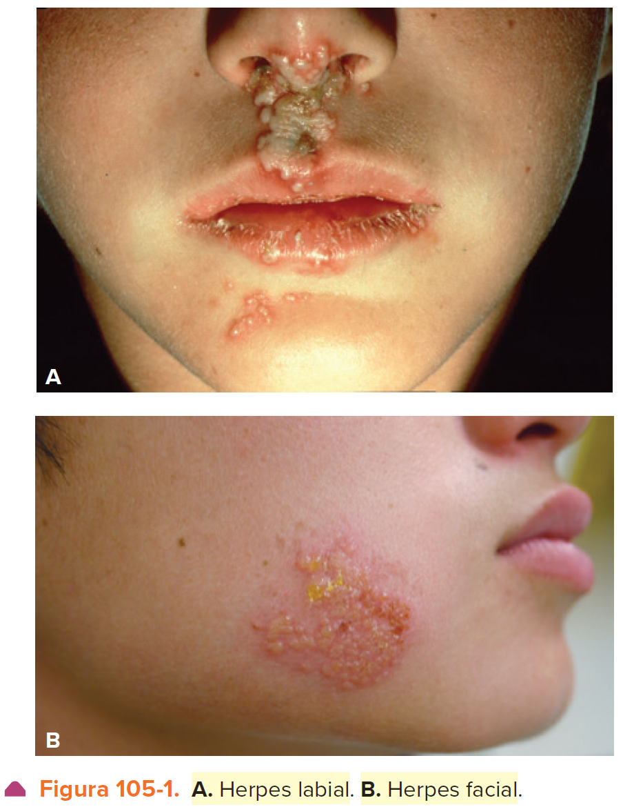 EL HERPES LABIAL SE LOCALIZA CON MAYOR FRECUENCIA EN EL LÍMITE ENTRE LA PIEL Y LAS MUCOSAS; POR ELLO, PREDOMINA EN LOS LABIOS O CERCA DE LA BOCA (FIGS.105-1 Y 105-4), PERO SE HA DESCRITO GINGIVOESTOMATITIS HERPÉTICA Y GLOSITIS GEOMÉTRICA HERPÉTICA.