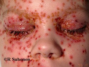 EL HERPES NEONATAL CASI SIEMPRE SE DEBE A VHS-2 (75%), Y ES UNA FORMA RARA, DISEMINADA (75%) Y GRAVE; EN OCASIONES SE CONFUNDE CON IMPÉTIGO. SEGÚN SU APARICIÓN, LAS LESIONES PUEDEN CLASIFICARSE DESDE LOS TIPOS LOCALIZADOS (PIEL, OJOS, BOCA, PREVALENCIA 45%); SISTEMA NERVIOSO CENTRAL (30%), HASTA LA VARIANTE DISEMINADA (25%), DE MUY MAL PRONÓSTICO.