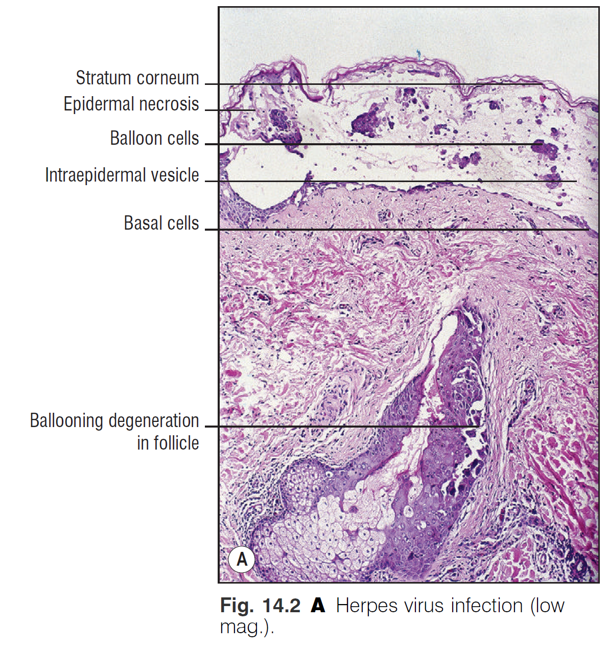 SE ENCUENTRA UNA VESÍCULA INTRAEPIDÉRMICA CON DEGENERACIÓN BALONIZANTE Y RETICULAR, QUE DA LUGAR A CÉLULAS GIGANTES MULTINUCLEADAS CON CAMBIOS VIRALES NUCLEARES (CÉLULAS EN BOLSA DE CANICAS).