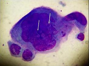 PUEDE SER ÚTIL EL CITODIAGNÓSTICO DE TZANCK (CAP. 1), QUE REVELA CÉLULAS GIGANTES MULTINUCLEADAS CON CUERPOS DE INCLUSIÓN NUCLEARES, QUE AL TEÑIRLAS CON EL COLORANTE DE WRIGHT O GIEMSA, SE OBSERVAN CÉLULAS FUSIONADAS CON VARIOS NÚCLEOS, SINCITIOS, ASÍ COMO INCLUSIONES NUCLEARES DE COWDRY.