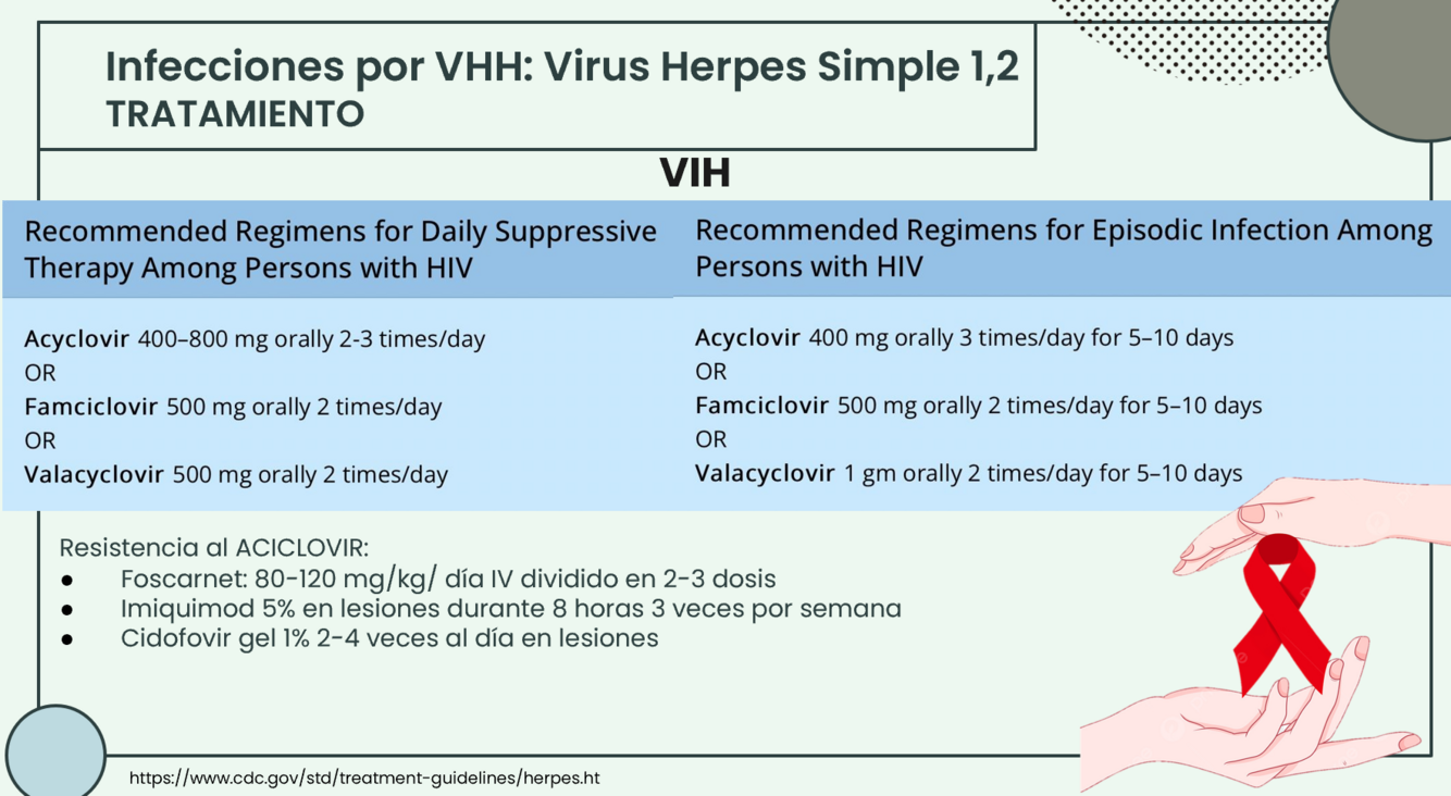 LA INFECCIÓN ATÍPICA POR VHS-1 Y 2 EN INDIVIDUOS VIH SEROPOSITIVOS REQUIERE A MENUDO UNA TERAPIA DE LARGO PLAZO INTENSIVA CON LOS ANÁLOGOS DEL NUCLEÓSIDO (ACICLOVIR, VALACICLOVIR, O FAMCICLOVIR) Y TAMBIÉN LA NECESIDAD DE COMENZAR TERAPIA ANTIRRETROVIRAL, QUE SE HA DEMOSTRADO DISMINUYE LA FRECUENCIA DE LAS LESIONES HERPÉTICAS SINTOMÁTICAS.