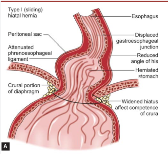 The most common type, accounting for more than 90% of cases. It involves a sliding movement of the gastroesophageal junction (GEJ) above the diaphragm alongside a portion of the stomach.